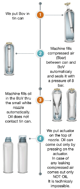 BOV system is widely accepted by major multinational companies.Compared to the regular filled aerosol cans, the BOV has following benefits for the environment, consumers and manufacturers: